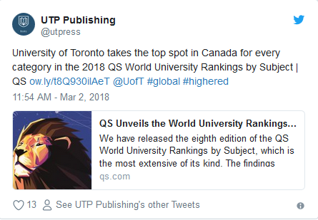 若按学科排名,多伦多大学的排名也不差:在艺术与人文学科排名第22;在工程与技术学科排名第43;在生命科学与医学排第13;在自然科学排第23;在社会科学与管理排第34。