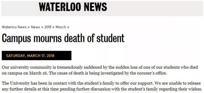 由于种种原因,滑铁卢大学每年都有非正常原因死亡的学生。