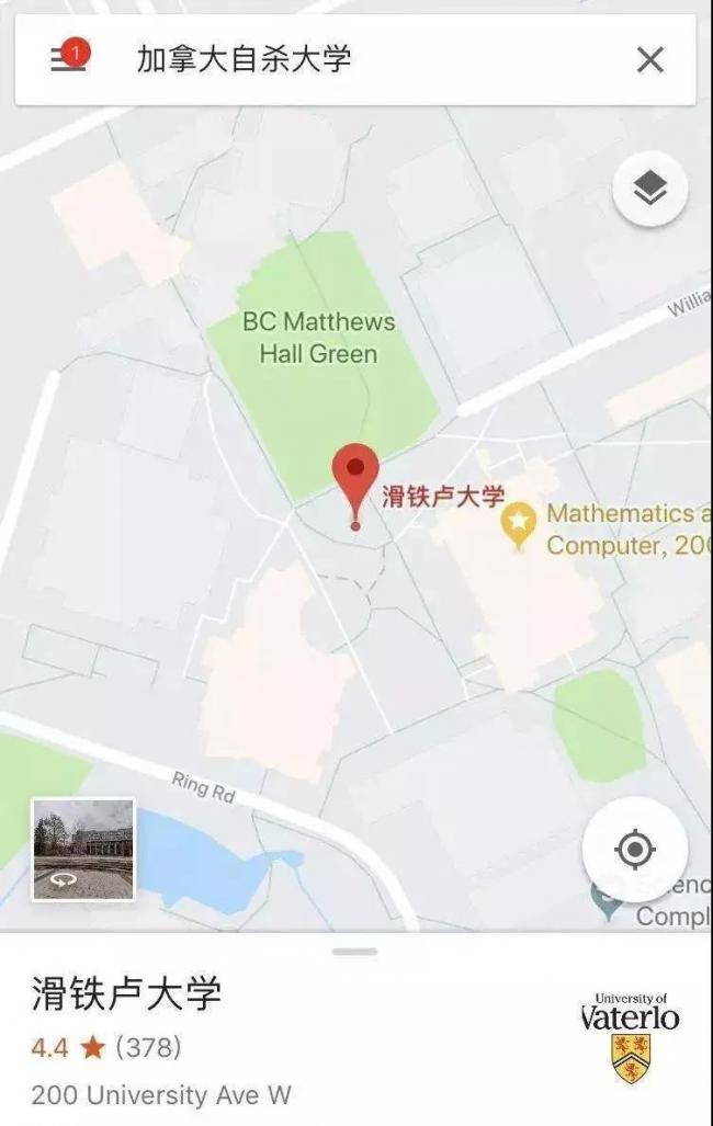 如果你在谷歌地图中输入“自杀大学”,它就会出现滑铁卢大学的导航,中英文搜索结果都是一样。