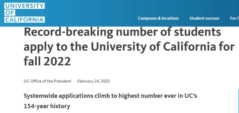 注意:统计数据不一定完全准确,仅供大家参考。这一届可以堪称史上“最惨”的UC申请人啦!相对于惨烈的录取数据,2022年UC的新生申请人数却创下了154年来最高历史记录!