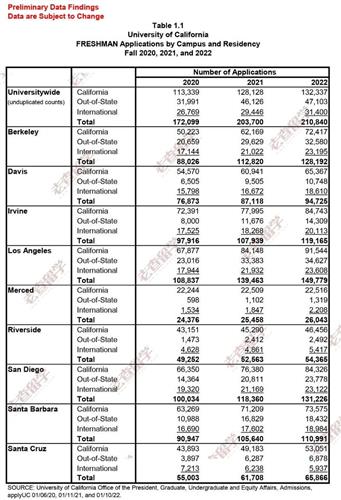 根据UC官网显示:申请加州系大学9个校区2022年秋季的新生申请人数共有210840人,相比去年203700人,一共增加了7140人,同期增长3.5%。在这21万多的申请人中,132,337人为加州本地申请者,47,103人为外州学生; 国际学生申请人数为31,400。加州大学系统各个分校2022fall申请数据如下: