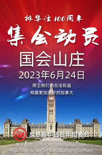 在排华法案100周年之际,加拿大大联邦参议院将于6月23日,举行“牢记百年排华法案”的官方仪式,而“反思排华法案百年系列活动组委会”也将在第二天的6月24日星期六,于渥太华国会山庄广场,举行牢记百年排华法案的数千华人大型集会,目前活动正在紧锣密鼓筹备之中。