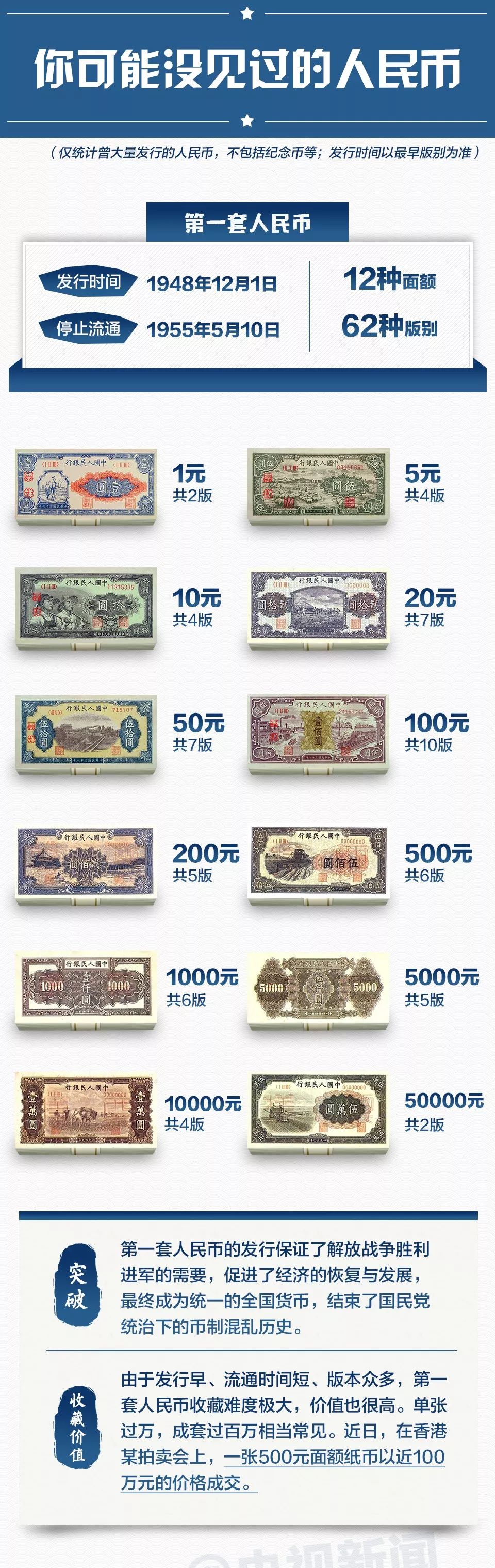 5月1日起,第四套人民币部分券别将停止在市场上流通。 实际上早在3月,第四套人民币即将停止流通的消息发出后,人们就已开始讨论,是将手上剩余的旧币尽早兑换掉,还是收藏起来坐等升值。不仅如此,第四套人民币的“退市”也带动了一、二、三套人民币的又一轮收藏热。 除了我们目前常用的第五套人民币,很多网友对已退出历史舞台的“老款”人民币或许并不太了解。第一套人民币长什么样?各套币种的收藏价值有多高?今天,央视新闻为你准备了一张人民币“图鉴”。如果你家里收藏有不认识的旧币,便可“按图索骥”,说不定你的那张就是值钱的珍品呢↓↓
