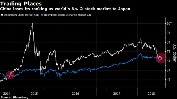 中国A股市场(白线)与日本股市(蓝线)市值对比(彭博社)