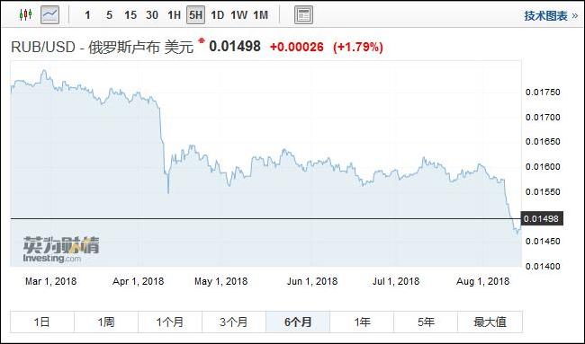 俄罗斯卢布持续贬值,对美元汇率上周跌幅近7%。图自英为财情