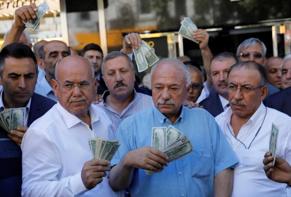 当地时间2018年8月14日,土耳其安卡拉,商人手持美元站在货币兑换处前,响应总统埃尔多安号召,出售手中的美元和欧元支持本国货币里拉。 东方IC 图