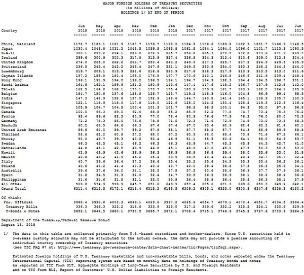 土耳其是自俄罗斯之后第二个退出主要持有国名单的国家,而这两国都在遭受美国制裁,进入8月后,土耳其宣告与美国开启了“经济战”。俄罗斯于5月退出了该名单,而巴西超越爱尔兰成为第三大美债持有国,总额为创纪录新高的3000亿美元。