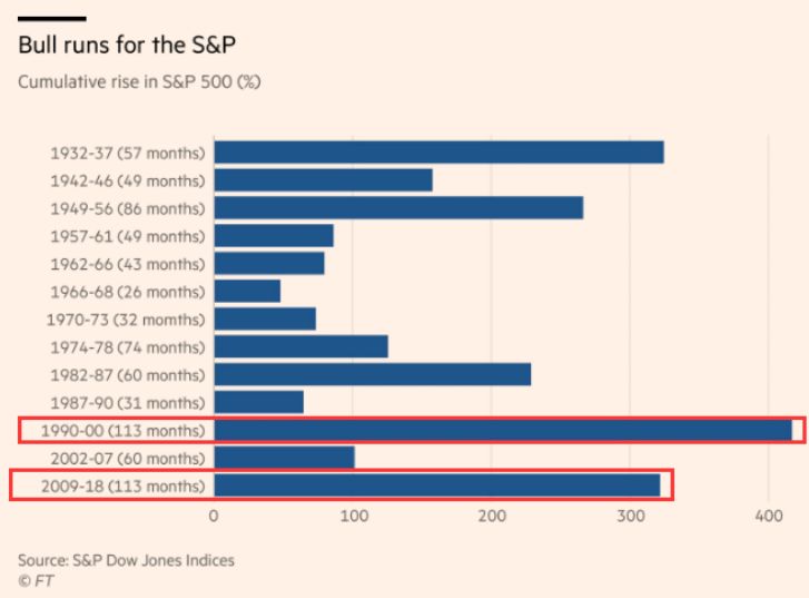 然而,这项纪录如今已成历史。截至美股8月23日收盘,本轮始于2009年3月9日的牛市(3453天)已经成功超越上世纪末期,