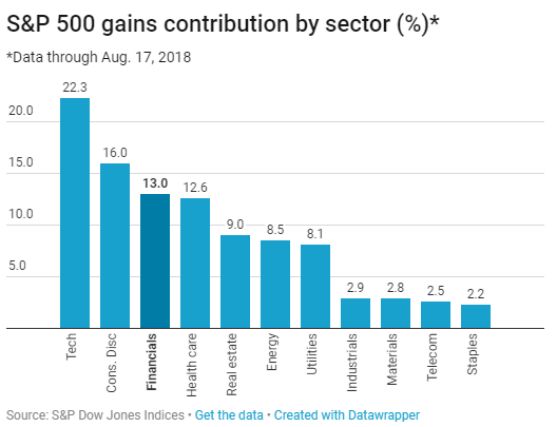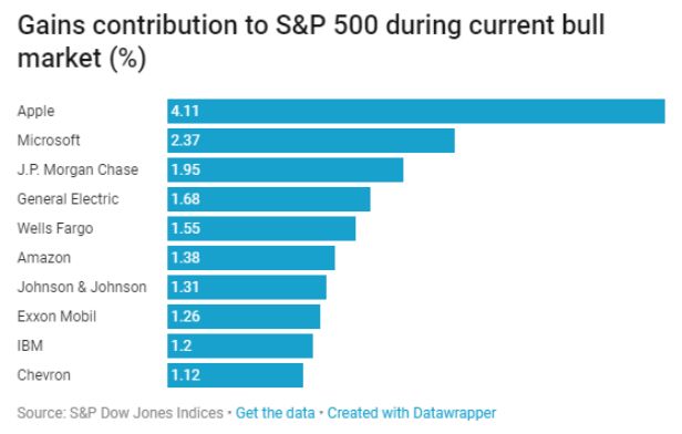 据标普道琼斯指数数据,自2009年3月9日以来,仅苹果一家公司就为标普500指数的走牛贡献了4.11%。排在之后的依次为微软(2.37%)、摩根大通(1.95%)、通用电气(1.68%)、富国银行(1.55%)、和亚马逊(1.38%)等。