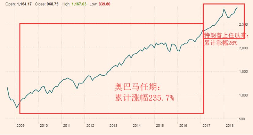 记者计算得出,在奥巴马任期的八年内,标普500指数累积上涨235.7%%,从676点涨到了2271点;而在特朗普上任的这近一年半的时间内,标普500的涨幅仅为26%,从2271点涨到了2863点。