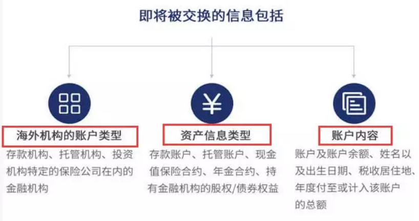 海外机构账户:存款机构、托管机构、投资机构、特定的保险公司在内的金融机构。 资产信息:存款账户、托管账户、现金值保险合约、年金合约、持有金融机构的股权/债券收益。 账户内容:账户及账户余额、姓名及出生日期、税收居住地、年度付至或计入该账户总额。