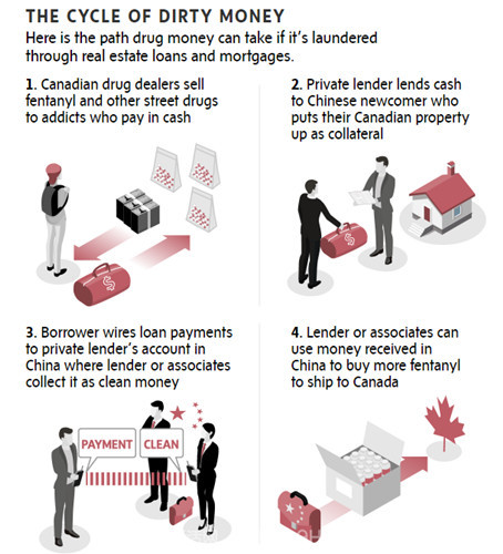 不少毒贩在街头出售芬太尼(Fentanyl)和其他毒品,再将街头贩毒得来的现金借给居住在温哥华的中国富豪。中国富豪则用温哥华本地的物业作抵押,然后向毒贩的中国账户还钱。