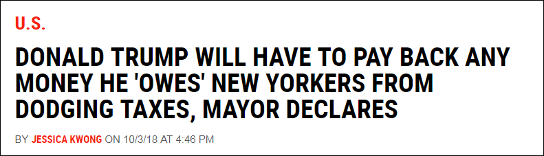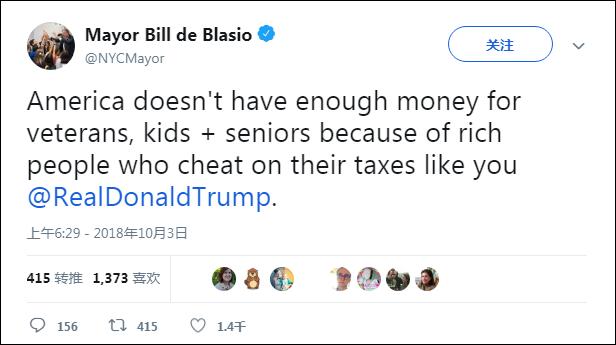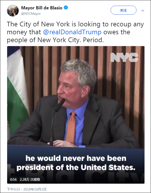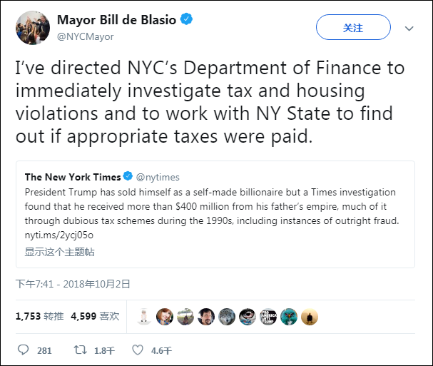 特朗普总统曾帮助父母逃税获得4.13亿美元财富”一事,美媒《新闻周刊》最新报道称,纽约市长白思豪于当地时间3日表示,该市和该州的税务局将对此事展开调查,追讨特朗普所欠缴的所有税款。