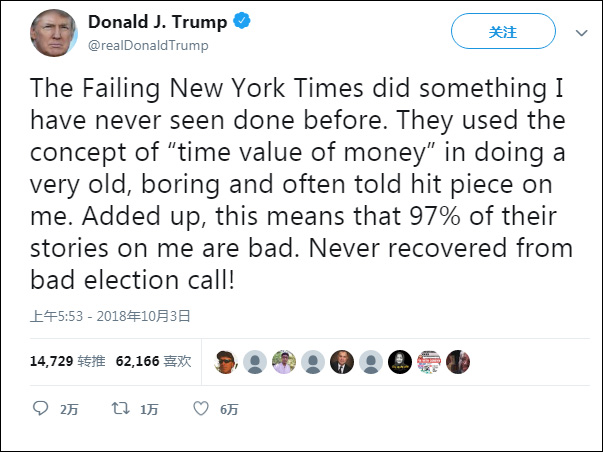 “失败的《纽约时报》做了我以前从未见过的事情。他们使用‘金钱的时间价值’的概念来做一个非常古老,乏味且经常关于我的热门事件。加起来,这意味着他们97%的关于我的报道都是负面的。没有从坏的选举报道错误中恢复过来!”
