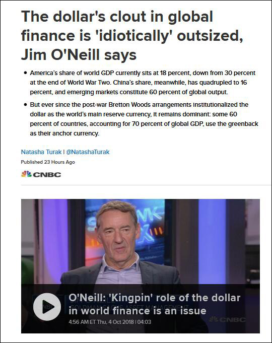 他说:“我们生活在一个古怪的环境中,美元在全球金融中扮演的角色居然比美国经济本身还重要,真是可笑!” 奥尼尔质疑,近几十年,美国占全球GDP比例明显下降,美元却仍能“呼风唤雨”。 他说,“美国政策与美元在全球金融中的核心地位是个大问题,特别是考虑到比起二战结束时,过去30年美国经济占全球GDP的比重不到20%,然而美元似乎却扮演着戏剧性角色。” 据CNBC报道,事实上,美国目前在全球GDP中所占的份额远远低于二战结束时的30%,仅为18%。而在此期间,中国的份额却增长了4倍,达到全球16%,同时新兴市场国家则占了全球产出的60%。 为何美元能有如此角色?CNBC解释称,部分原因在于,自战后布雷顿森林体系建立以来,美国作为全球主要储蓄货币的地位一直占据着主导地位,全球有约60%的国家(GDP占全球70%)将美元作为其“货币锚”(anchor currency)。而美国资产中尤其是美国国债,在各国中央银行外汇储备中的比例以及以美元计价的国际贸易,继续推升美元的这一主导地位。 美元走强,新兴市场遭重创 奥尼尔还指出,自去年春季美联储加息后,带来了美元走强,更进一步损害了新兴市场。 据CNBC报道,新兴市场国家已经背负着大量以美元计价的债务,美元走强意味着他们的偿债成本变得更高,负担更为沉重。 据报道,自2008年金融危机以来,新兴经济体非银行部门以美元计价的债务水平已经翻了一番。而对于那些如土耳其这样依赖外资的许多国家而言,奥尼尔认为:“如果强美元持续下去的话,很多国家势必将陷入困境。”![]()