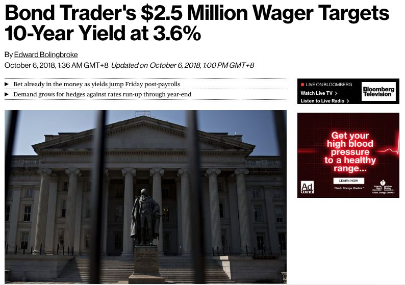不过就目前看来,美债收益率的攀升并没有在整个美国经济体系中大幅增加通胀压力。通胀预期指标显示,美国目前通胀保持稳定,接近美联储2%的目标。 神秘资金下注10年期美债收益率冲高至3.6% 彭博报道称,美东时间周四下午,一名看跌期权的买入者对10年期美债收益率冲高至3.6%押注250万美元,合约到期时间为美联储12月会议的两天后(即12月21日)。 从这笔神秘的押注来看,已经有交易员采取实际行动,认为美债会进一步被抛售。彭博社报道截图