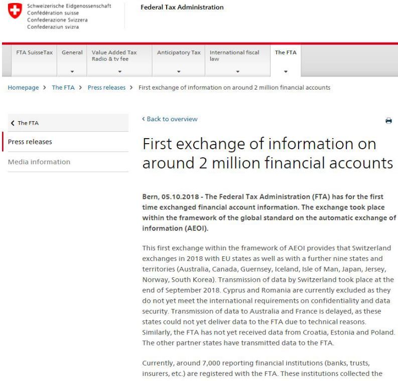 上述公告表示,首批按照AEOI标准与瑞士联邦税务管理局进行信息交换的国家为欧盟国家和其他9个国家和地区:澳大利亚、加拿大、英属根西岛、冰岛、英属马恩岛、日本、英属泽西岛、挪威以及韩国。 不过,在欧盟成员国中,塞浦路斯和罗马尼亚被排除在外,因为它们尚未满足保密性以及数据安全上的国际要求。此外,瑞士向澳大利亚和法国的数据传送暂时延迟,因为这两国出于技术原因尚未向瑞士联邦税务管理局传送数据。同时,瑞士联邦税务局还没收到克罗地亚、爱沙尼亚和波兰的数据。 瑞士联邦税务局披露,截至目前,包括银行、信托和保险公司在内的约7000家机构在瑞士联邦税务局处登记并与该机构共享金融账户信息。