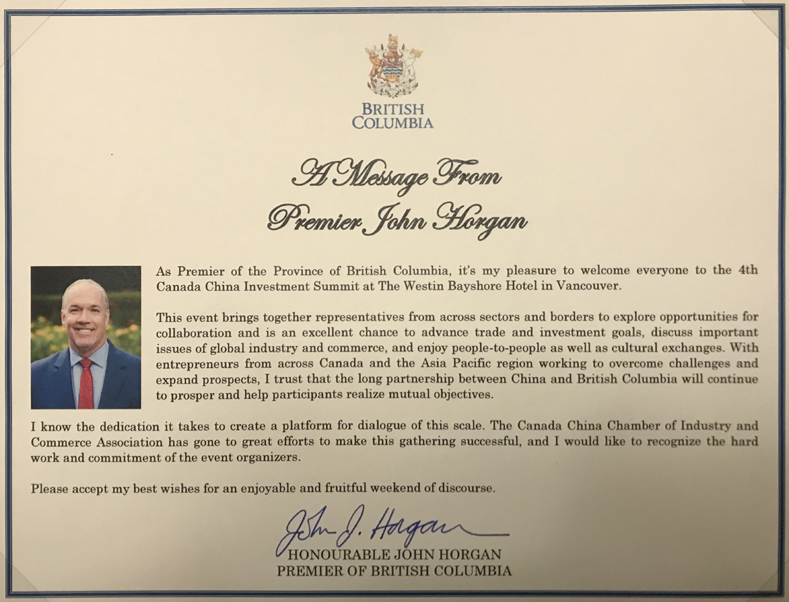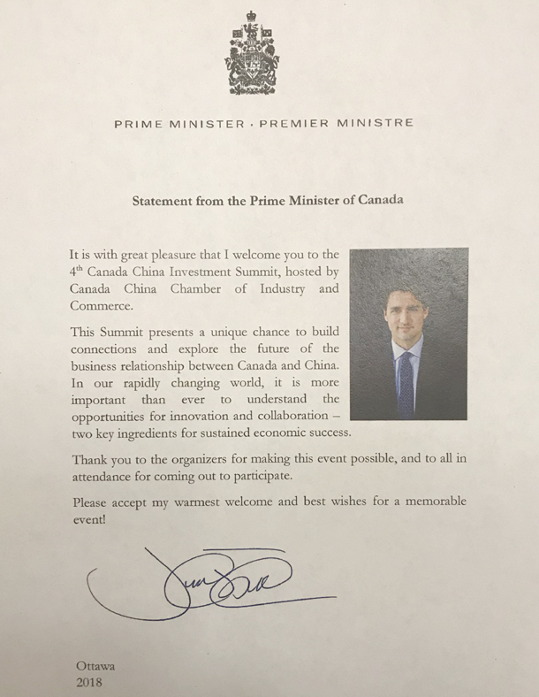 ??? (本报讯)10月6日,由中国侨商联合会与加拿大中国工商联合会共同主办的第四届加中投资峰会在温哥华隆重举行。加拿大总理特鲁多(Justin Trudeau)为峰会发来贺信,对峰会的召开表示祝贺,感谢主办方举办此次峰会为加中两国工商界提供交流合作机会。