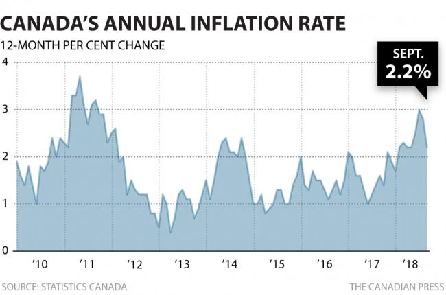 加拿大统计局本周五(10月19日)公布的报告,9月份的年通胀率为2.2%,为4个月以来的最低水平。