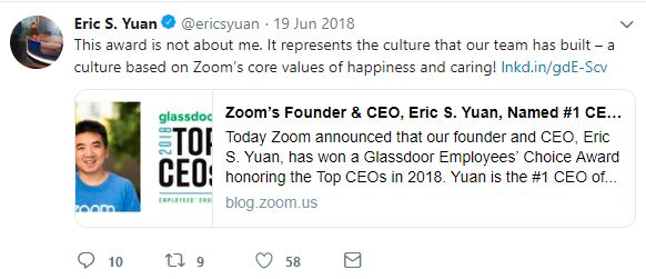 除了本身产品优秀以外,Zoom的成功,也归功于袁征卓越的管理能力,也体现了这个山东大汉体贴的一面,他在LinkedIn个人资料里写着,“为用户带来快乐,你的快乐就是我的幸福”。
