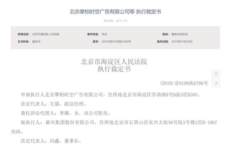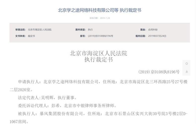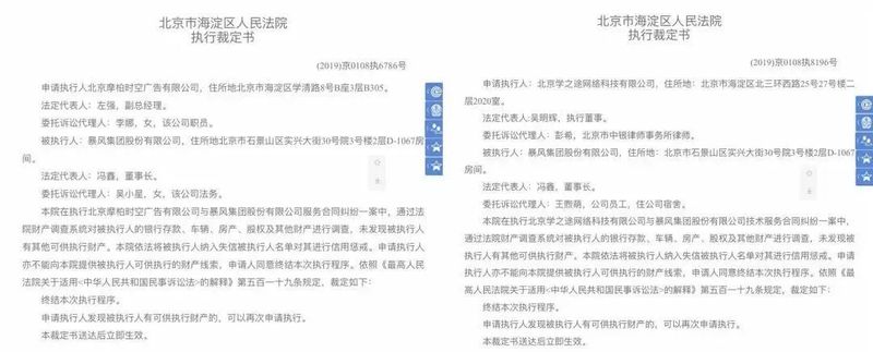 7月24日,北京法院审判信息网发布了两份执行裁定书,两个案件的申请执行人分别为“北京学之途网络科技有限公司”与“北京摩柏时空广告有限公司”。