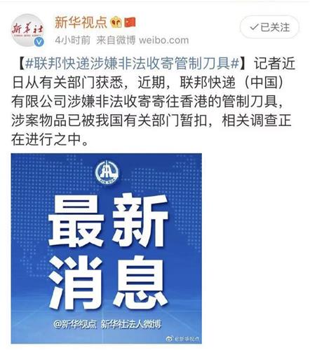 8月18日,据人民日报消息, 晋安公安在线通报,该局近期接到报警,福建某运动用品公司收到由美国联邦快递公司承运的一美国客户寄出的快递包裹,内有枪支。目前,福州警方已将枪支暂扣,并开展立案调查。加上这一次联邦快递(中国)有限公司涉嫌非法收寄寄往香港的管制刀具。经过多次的欺瞒这后,谁还会相信这么一家快递公司呢?根据中国相关法律法规,快递企业应当严格执行收寄验视制度,对禁止运输、寄递,存在重大安全隐患的物品,不得运输、寄递。联邦快递在华开展业务已有三十多年,理应知晓枪支弹药、管制刀具等属于中国《禁止寄递物品目录》之列。然而,他们却屡禁屡犯。用国际锐评的话说就是“顶风作案,自毁招牌”。