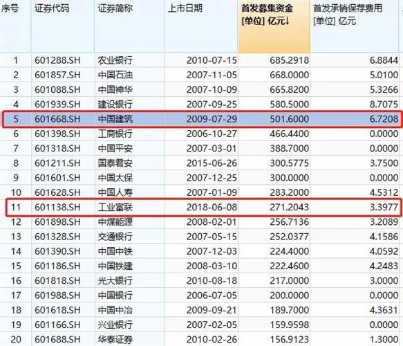 8、主承销商是中信建投证券。2009年中国建筑募资502亿元,承销费用为6.72亿元;2018年6月工业富联募资271亿元,承销费用为3.4亿元。