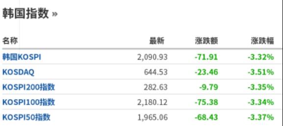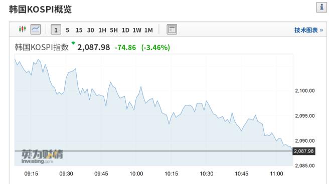 2月24日,韩国首尔综指开盘大跌,随后跌幅扩大至3%。截至11点左右,韩国KOSPI指数报收2087.98点,跌幅3.46%。