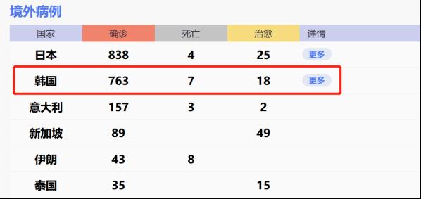 据央广网报道,韩国中央防疫部门24日上午通报,韩国新增161例感染新冠病毒确诊病例,同时新增1例死亡病例。目前全国累计763例,累计死亡7例。韩国一跃成为除“钻石公主号邮轮”之外疫情最严重的的海外国家。