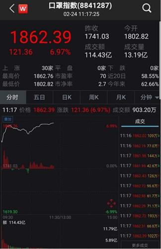 从盘面上看,当天A股市场口罩股大涨,口罩指数涨幅超6%以上。