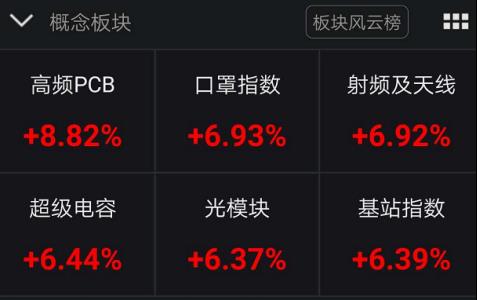 与此同时,电子、通信等科技类板块继续强者恒强,高频PCB、超级电容等概念股板块涨幅居前。