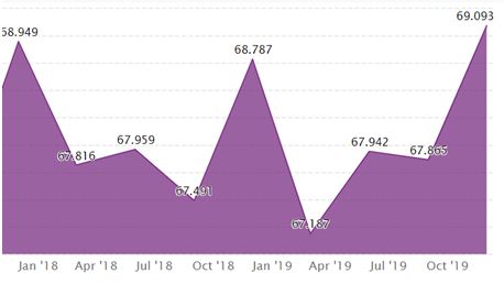 2017年1月至2019年12月美国私人消费占GDP百分比(数据来源:环亚经济数据数据库)
