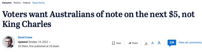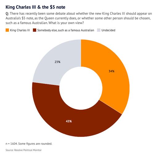 据Resolve Strategic进行的一项名义调查发现:只有34%的澳洲人认为查尔斯三世国王的头像应该在未来出现在5澳元的纸币上,而43%的人则更希望看到其他人,比如澳洲本土的名人,另有23%的人表示不确定。如果以政治倾向来分类的话,关于此议题则存在更大的不同意见:在联盟党选民中,51%的人希望新君主出现在纸币上,但只有31%的工党选民和13%的绿党选民认同这一观点。47%的工党选民希望纸币上能印上澳洲本国人,联盟党选民持此看法的比例为32%,而绿党选民的这一比例为69%。