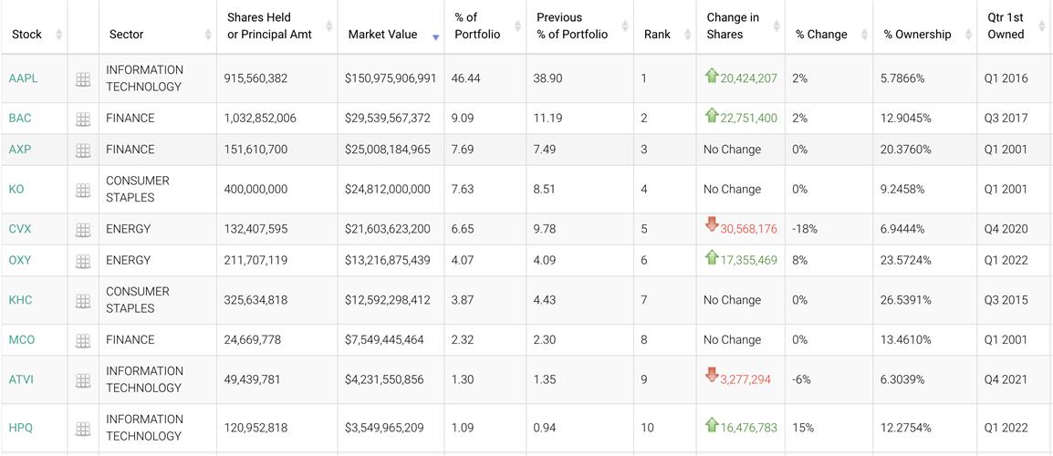 伯克希尔·哈撒韦2023年一季度前十大持仓 数据来源:13F数据平台Whalewisdom