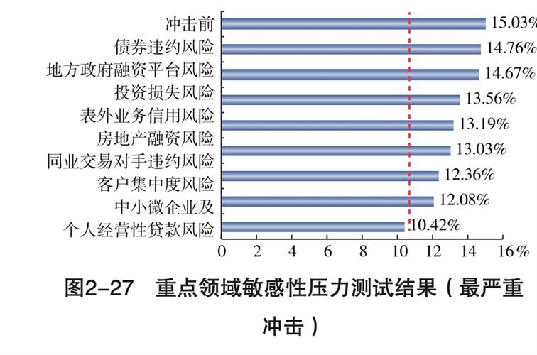 报告指出,在中小微企业及个人经营性不良贷款率上升600%的冲击下,全部参试银行整体资本充足率降至10.42%,下降4.61个百分点。若最大5家非同业集团客户、同业交易对手违约(损失率60%),整体资本充足率分别降至12.08%、12.36%,分别下降2.95、2.67个百分点。若房地产开发不良贷款率、购房及其他不良贷款率分别上升15、9个百分点,房地产非标准化、标准化资产不良资产率分别上升15、9个百分点,整体资本充足率下降至13.03%,下降2个百分点。
