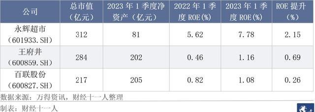 2022年,零售行业颇为艰难,除汽车之外的社会消费品零售总额为39.4万亿元,同比下降0.4%。2022年,限额以上超市零售额同比增长3%,百货店下降9.3%。2023年一季度,超市百货行业开始复苏。2022年一季度,20.5%的样本公司亏损;2023年一季度,13.6%的样本公司亏损。2023年一季度与去年同期相比,54.5%的样本公司ROE上升,18.2%下降。行业景气上升度为36.3%(54.5%-18.2%=36.3%)。2022年一季度样本公司的ROE中值为0.93%,均值为1.38%;2023年一季度ROE中值为1.16%,均值为1.67%。ROE中值、均值分别提升24.7%、21%。样本公司中,截止2023年3月31日市值最高三家公司的情况如下: