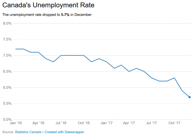 去年最后三个月加拿大失业率一降再降:其中10月份的失业率为6.3%,11月份降至5.9%,12月则再降至5.7%。