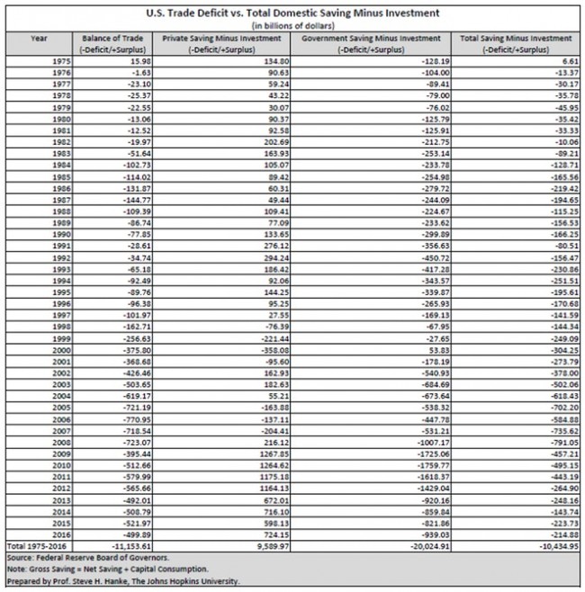 下面这个表格表明,美国的数据支持上述贸易等式。自1975年以来,美国的贸易赤字累计达到11.154万亿美元,总投资减去储蓄大约为10.435万亿美元。