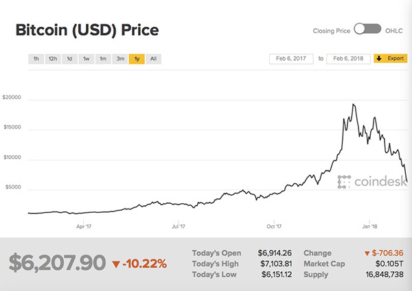 美国股市2月5日大跌引发的避险情绪进一步加快了正处于下跌通道的比特币的下跌速度。根据数字货币信息网站Coindesk报价,2月6日中午13时,比特币价格为5995美元左右,延续前几日的下跌,单日跌幅逾10%。而2月1日,比特币刚刚跌破1万美元,没想到短短5日又跌逾35%。