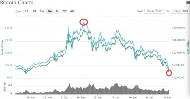 最近一段时间,比特币涨势猛然熄火,价格从2017年12月17日的20000美元,一路惨摔。2月6日午后,GDAX平台显示,比特币价格跌破6000美元大关,24小时跌幅超25%。仅仅51天时间,就跌去了70%。
