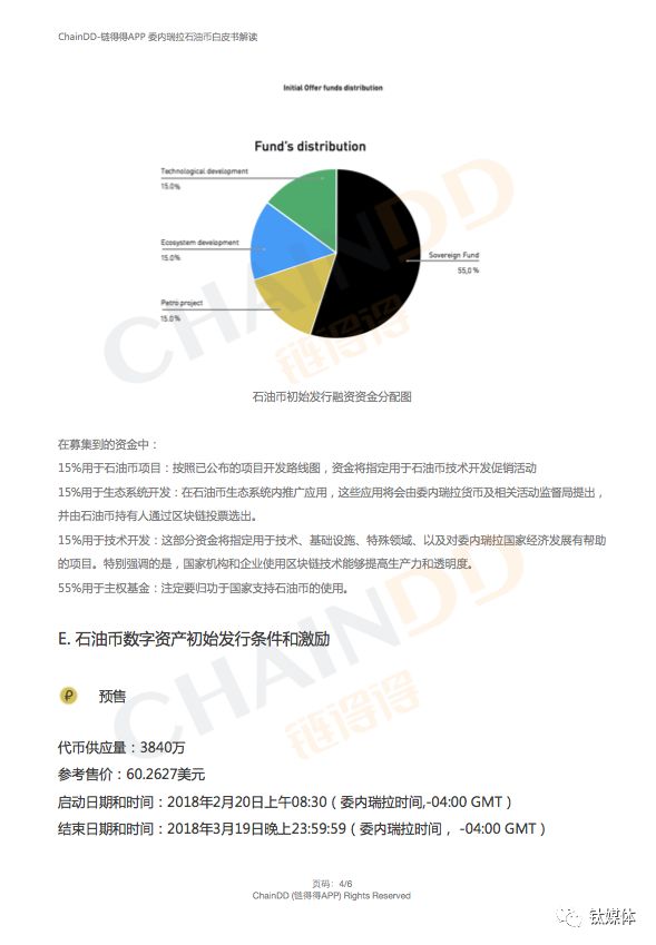 2.预售:代币供应量3840万;参考售价60.2627美元。启动日期和时间:2018年2月20日上午08:30(委内瑞拉时间,-04:00 GMT)结束日期和时间:2018年3月19日晚上23:59:59(委内瑞拉时间,-04:00 GMT)