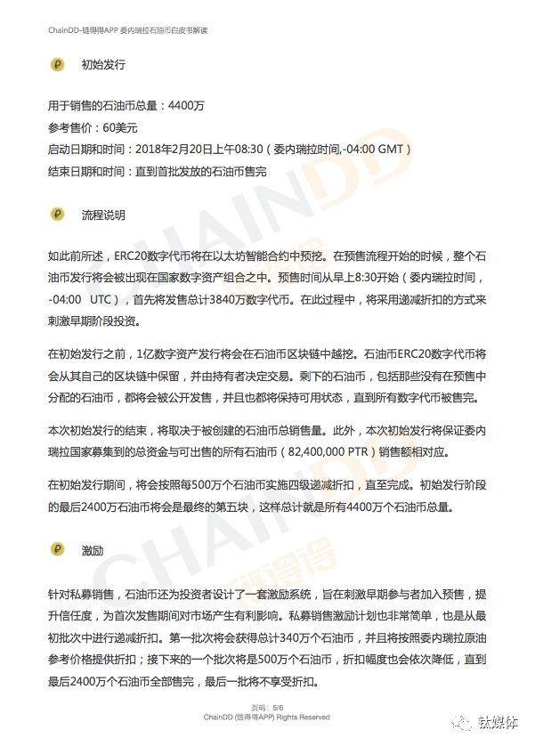 5.激励:针对私募销售,石油币还为投资者设计了一套激励系统,旨在刺激早期参与者加入预售,提升信任度,为首次发售期间对市场产生有利影响。私募销售激励计划也非常简单,也是从最初批次中进行递减折扣。第一批次将会获得总计340万个石油币,并且将按照委内瑞拉原油参考价格提供折扣;接下来的一个批次将是500万个石油币,折扣幅度也会依次降低,直到最后2400万个石油币全部售完,最后一批是没有折扣的。