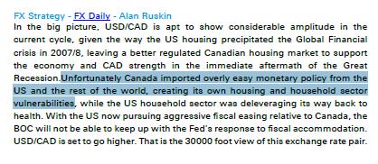 “美元兑加元汇率(USD/CAD)将出现当前周期内的可观振幅。考虑到美国房地产市场触发2007/8年全球金融危机,大衰退后,一个监管健全的加拿大房地产市场支撑了经济和加元汇率,
