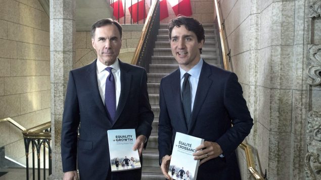 星期二下午,公布预算案之前,加拿大财政部长莫诺(Bill Morneau)和总理特鲁多一起出现在媒体面前。 CP/Justin Tang