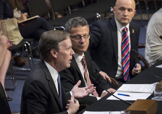 左起美国前任驻俄国大使尼古拉斯伯恩斯; 北约卓越战略传播中心主任Janis Sarts; 波士顿大学的Vesko Garcevic在参议院情报委员会就俄国干扰美国大选作证。 (AP Photo / J。Scott Applewhite)(AP Photo/J. Scott Applewhite)