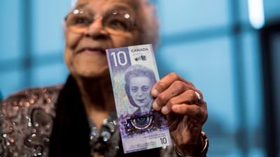 当部长和行长为新的10元纸币揭幕时,现场爆发出欢呼声。货币上印的是加拿大历史上的一位黑人妇女。