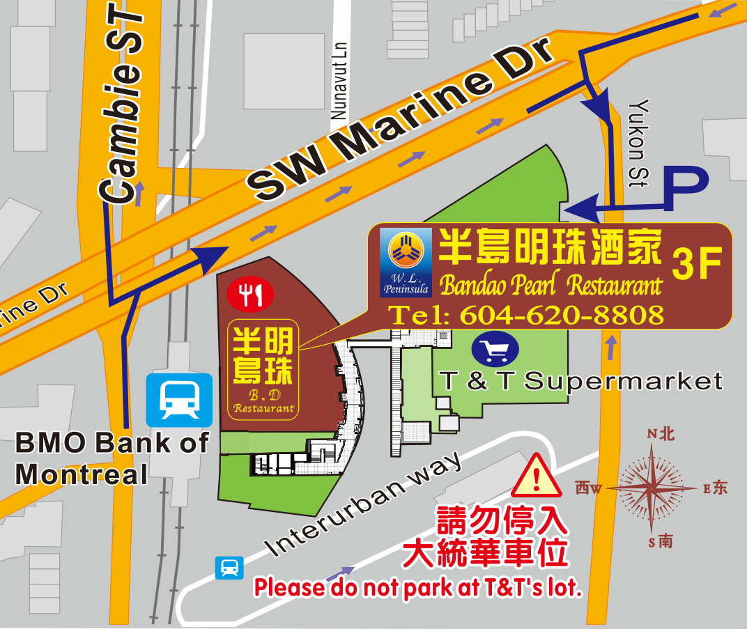 温哥华半岛明珠酒家 电话:604-620-8808 地址:#308-470 SW Marine Dr, Vancouver, BC
