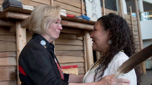 联邦政府土著人事务部长 Carolyn Bennett 在新闻发布会后与土著人女性 Ceejai Julian 在一起 / Justin Tang/Canadian Press