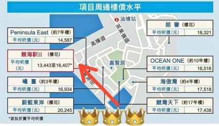 旁边的曦台楼盘(3年楼盘),目前平均呎价16934港元(约合人民币15.6万/平方米),蔚蓝东岸(楼花)平均呎价20245港元(约合人民币18.6万元/平方米),朗誉(楼花)平均呎价18321港元(约合人民币16.9万元/平方米),Ocean One(10年楼)平均呎价16516港元(约合人民币15万元/平方米)。