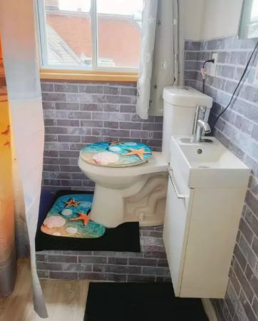 厨房的右侧是浴帘,它是房间与厕所和马桶之间唯一的隐私屏障。
